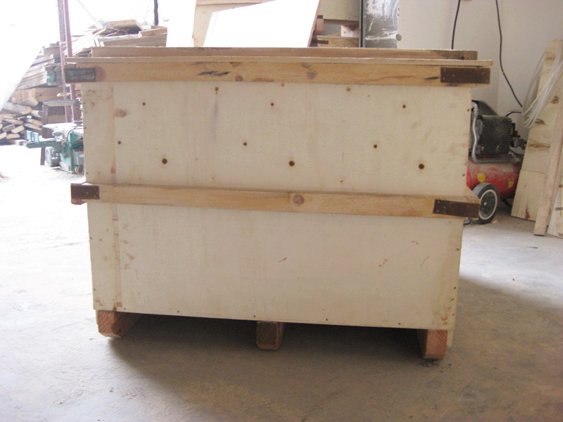 國內膠合板包裝箱含有箱板和固緊連接件,并且箱板通過固緊連接件構成相鄰箱板相互垂直的包裝箱,在每一個箱板外表面四周邊緣分別固定有一定數量的鋼卡釘連接件,相鄰箱板上的鋼卡釘連接件分別穿過位于該相鄰箱板垂直交接處的角鋼形連接件上設有的長條孔,并且其端部反向折彎固定,使相鄰箱板垂直固定連接,并構成包裝箱。